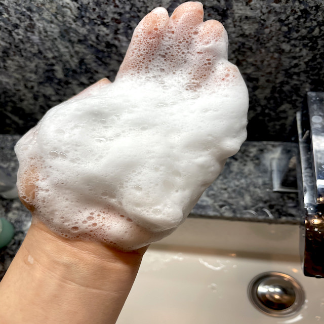 泡立てネットを使って泡立てました。もこもこ濃密泡でひっくり返しても落ちません。こすらず優しく洗えます。